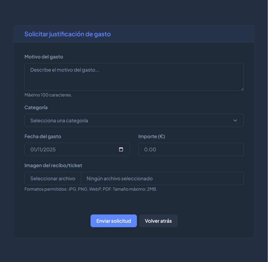 Olvídate del papeleo: tu equipo solo tiene que indicar el tipo de gasto, el importe y adjuntar el justificante con una foto desde el móvil o en PDF. Rápido, sencillo y sin complicaciones.